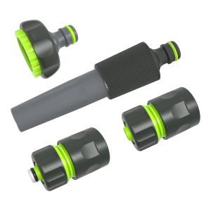W skład zestawu wchodzi lekka i funkcjonalna dysza zraszająca z możliwością ręcznej regulacji strumienia, dwa szybkozłącza – w tym jedno z funkcją STOP umożliwiającą wymianę akcesoriów bez odcinania dopływu wody – oraz przyłącze do kranu. Każdy element zestawu wykonany został z trwałego tworzywa sztucznego odpornego na promieniowanie UV i warunki atmosferyczne, co zapewnia długą żywotność i bezproblemową eksploatację.